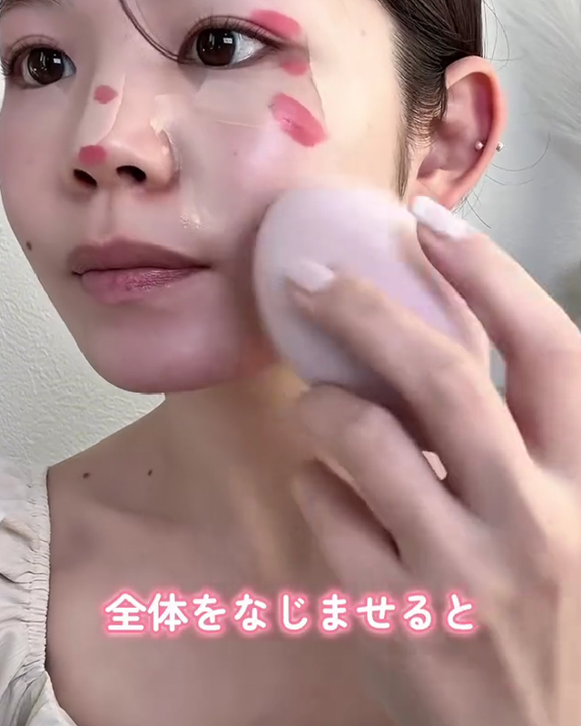 ベースメイクとチークをなじませながら、全体に広げることで、自然な仕上がりになりました。