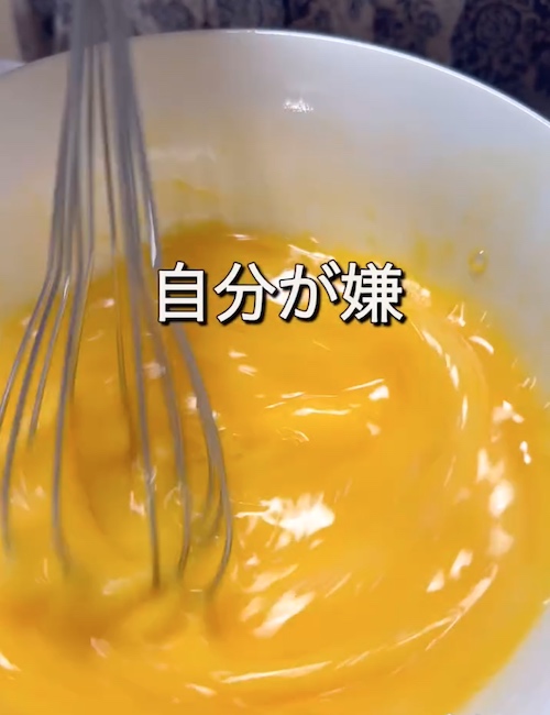 ラーメン用のどんぶりに卵を入れ、水を加えながらしっかりと混ぜます。