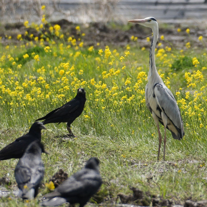 畑を訪れていたのは、4羽のカラスと1羽のアオサギです。