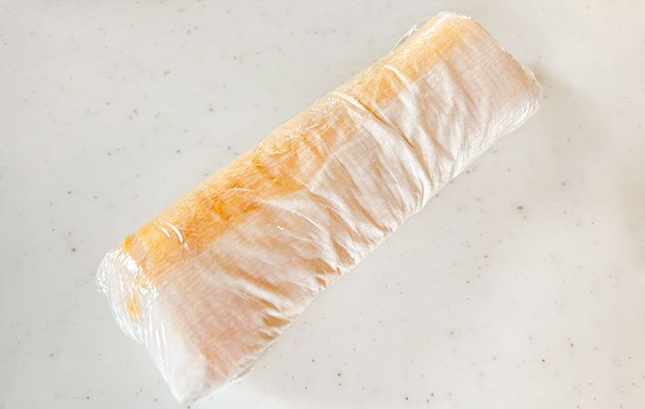 最後まで巻いたら、白身ロールの完成です。いったん、まな板の上などに置いておきます。
