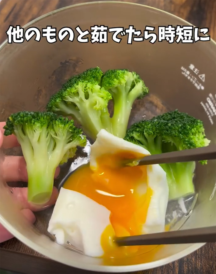 すると、ポーチドエッグが簡単にでき上がりました。ほかの食材を一緒にゆでれば、時短になりますよ!
