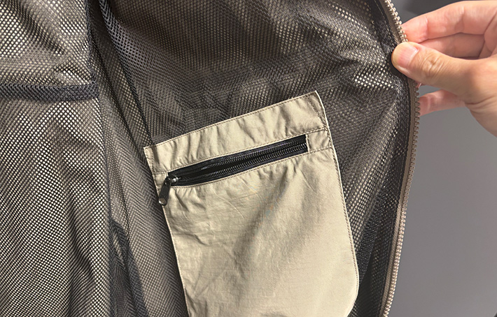 また裏地は、通気性のいいメッシュ仕様になっています。左側にはジッパーつきの内ポケットを装備しているので、パスケースやカギをスマートに収納できるのがポイント!