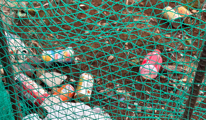 空き缶を拾うにしても、立てかけられたネットが邪魔をして、片付けることができません。