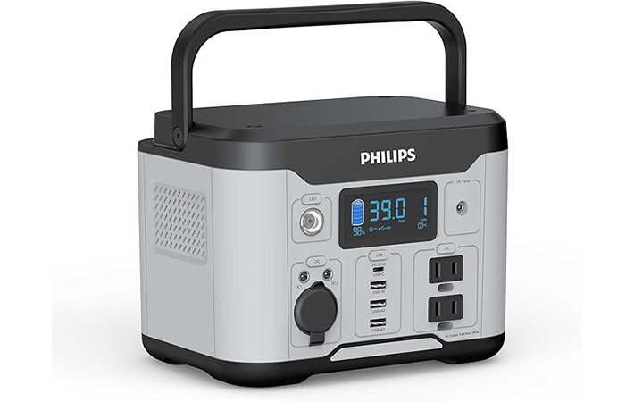 Philips 300W/296Wh(14. 8V換算) ポータブル電源 大容量 ポータブルバッテリー バックアップ電源 9台同時充電 パススルー機能 純正弦波 AC(瞬間600W)/DC/PD 60W USB-C/シガーソケット出力 5つ充電方法 ledライト付 非常用電源 ソーラー充電 PSE認証済 DLP8091C
