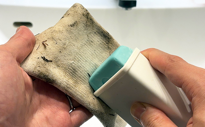 濡らした靴下にブラシを当てて、コロコロと転がすと…。