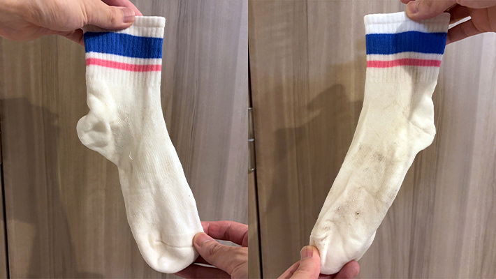 靴下の白さが全体的に違うのと、特に頑固な汚れがつきやすいカカトやつま先部分まで、キレイになっているではありませんか!