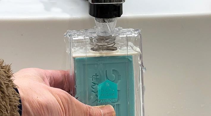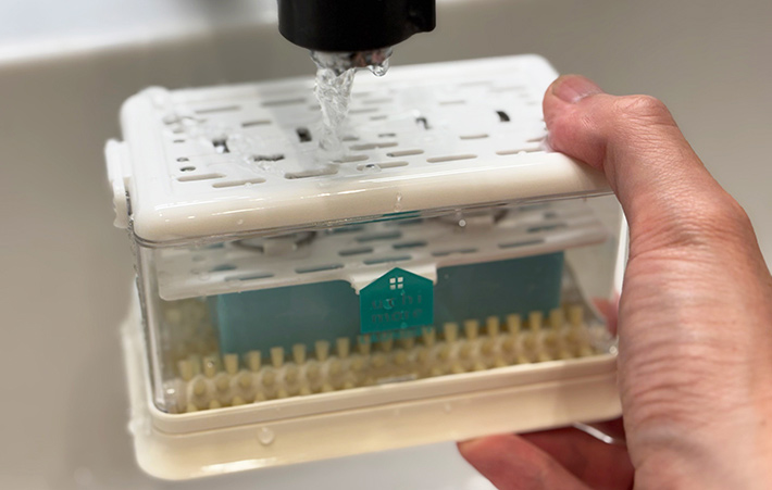 『ウタマロ石けん』を収納したスリムケースに水を注いで…。
