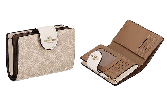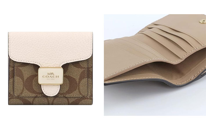 ベージュとホワイトを組み合わせた優しい色合いがおしゃれな、2つ折りの財布。