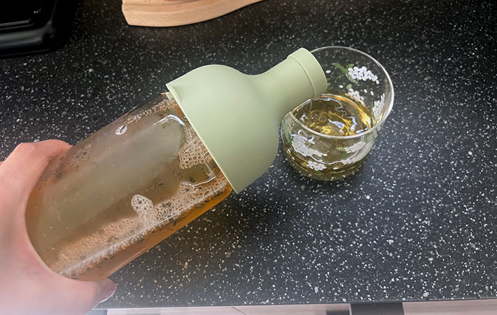 食事をする時に、水出し茶をワインのように楽しんでほしいという思いからできた、ワインボトル型の水出し茶ボトル。
