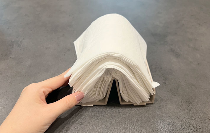 このティッシュケースには、一般的なサイズのティッシュボックスやソフトパックタイプのティッシュの中身をそのまま詰め替えることが可能。