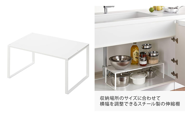 シンク下の収納に設置して、空間を有効活用できる『伸縮収納棚』。