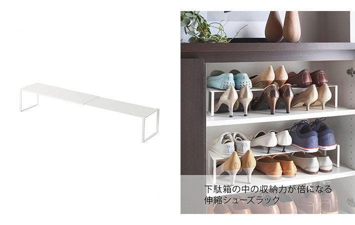 下駄箱に設置するだけで、下駄箱の収納力を倍にしてくれる伸縮シューズラック。