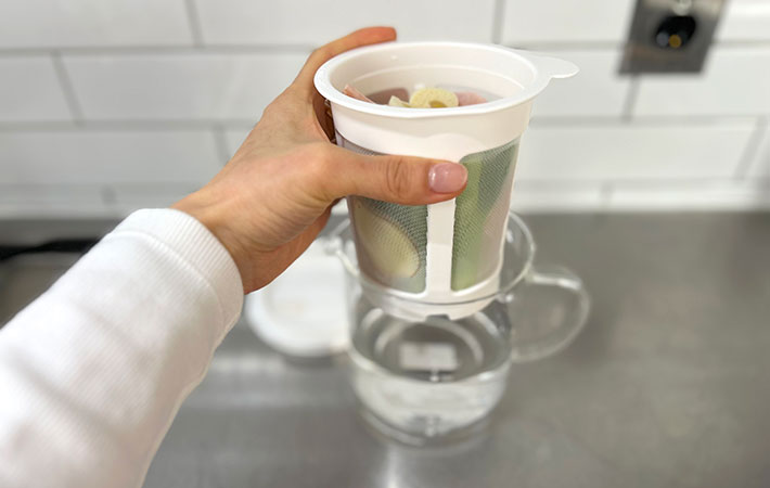 ストレーナーの底にへこみがついており、そのへこみをポットの縁に引っかければ最後の一滴まで逃さずだしを抽出することができるんです!