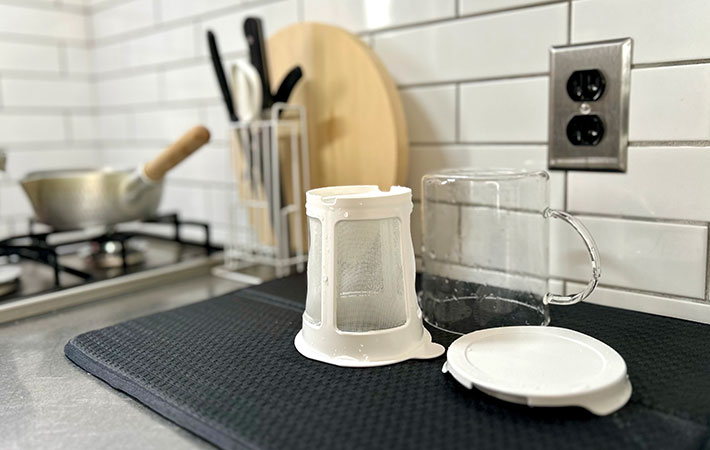 目の細かいストレーナーもスポンジで優しく洗えば、脂も汚れもしっかり落ち、ガラス本体は口が広いので、底まで手を入れて洗いやすいですよ!