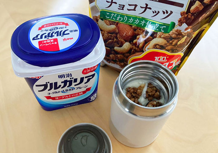 最後に、冷たいご飯も試したくなって、ヨーグルトとグラノーラを入れてみました。
