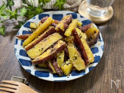 バターと砂糖をよく絡めたら、皿に盛りつけ、仕上げに黒いりごまをふれば完成です。