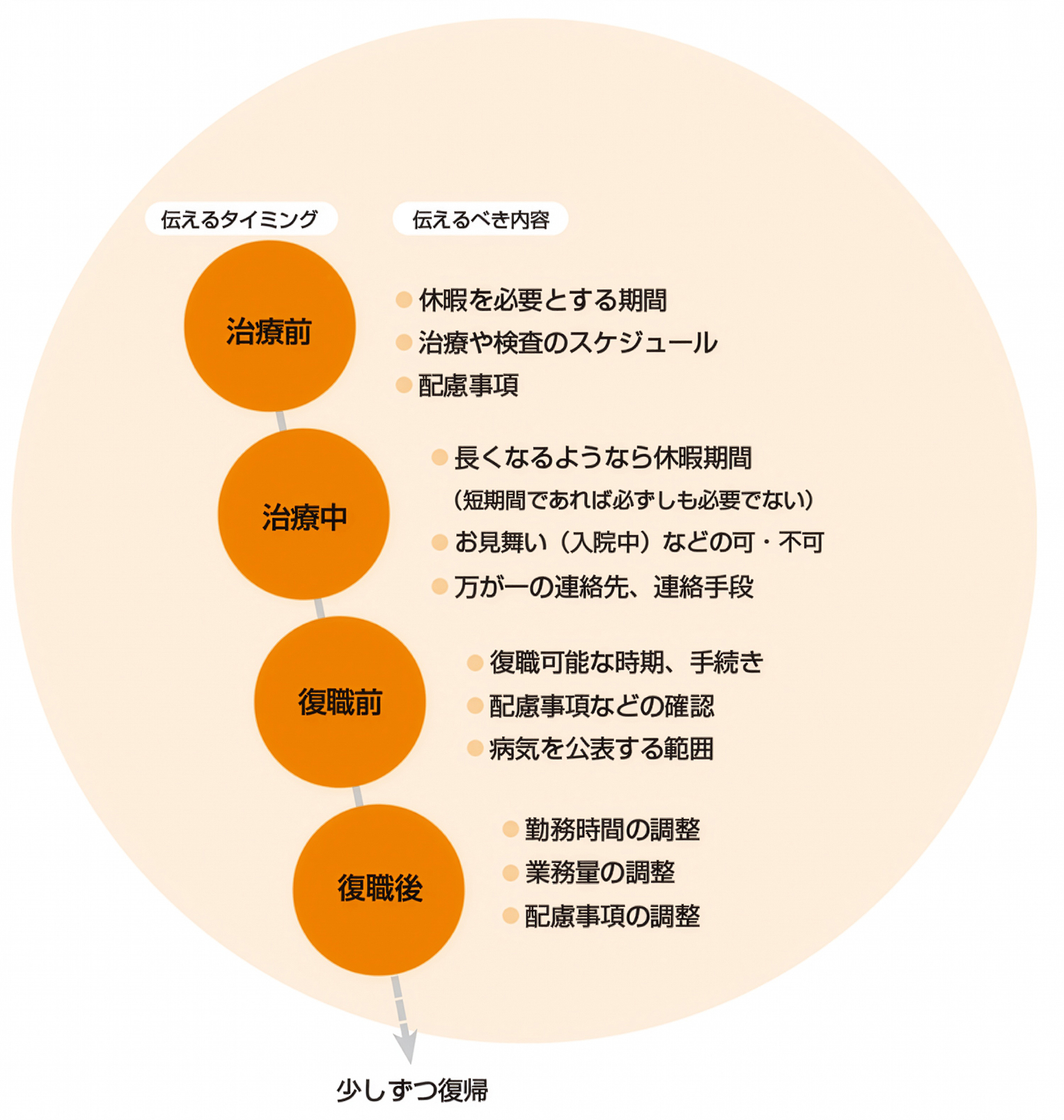 『誰に、どこまで、いつ伝えるか』について、「これがよい」という正解はありませんが、治療前から復職後までの流れが事前に分かっていると、実際に伝える場面を想定しやすくなり、安心できるかもしれません。