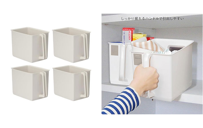 キッチンの吊り戸棚といった高い場所の整頓に使えるハンドルつきのボックス。