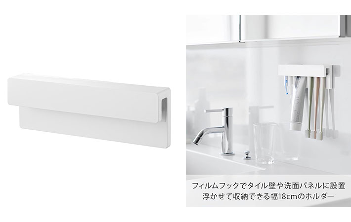 洗面所の壁や洗面パネルなどに、フィルムフックで設置できる『歯ブラシ&チューブホルダー』。