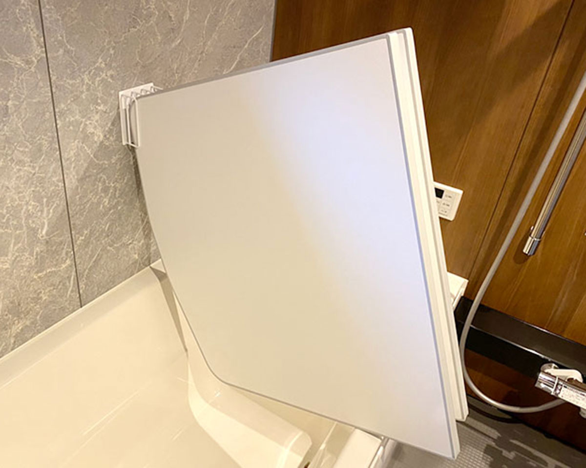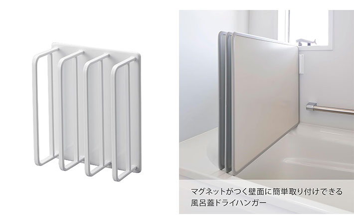 浴室の壁にマグネットで設置でき、壁から離して蓋同士、隙間を空けて干すことができるので、乾きやすいのが特徴です。