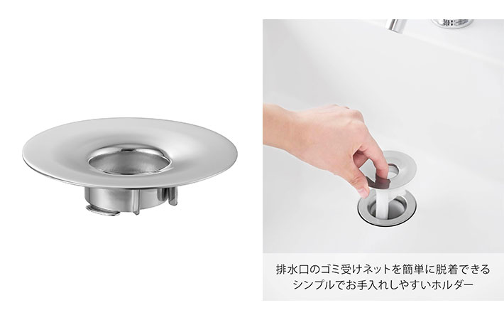 こちらは、洗面台の排水口のゴミ受けネットを取りつけられるホルダー。