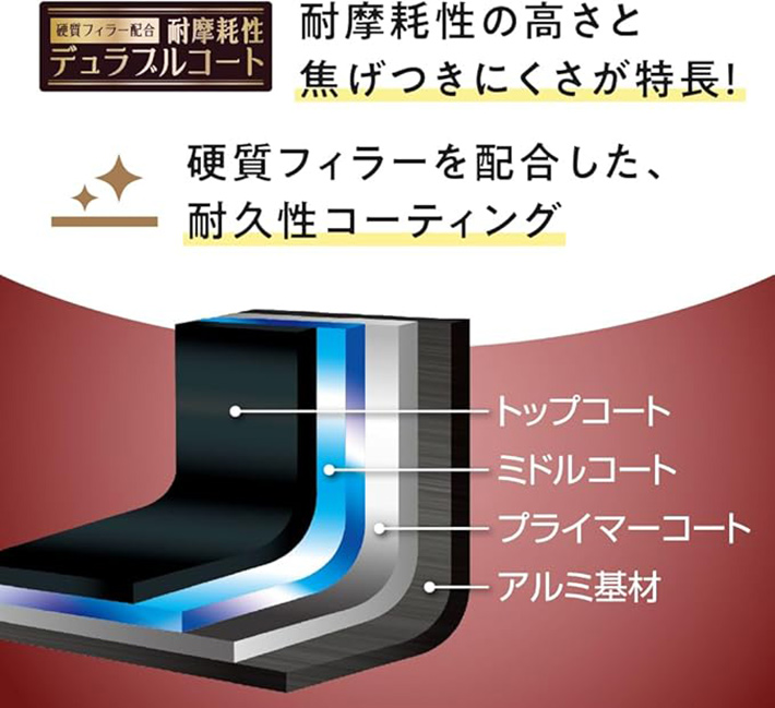 耐摩耗性や耐久性を高めるコーティングが施されており、焦げつきにくさが特徴といいます。