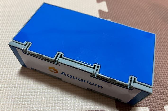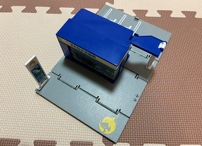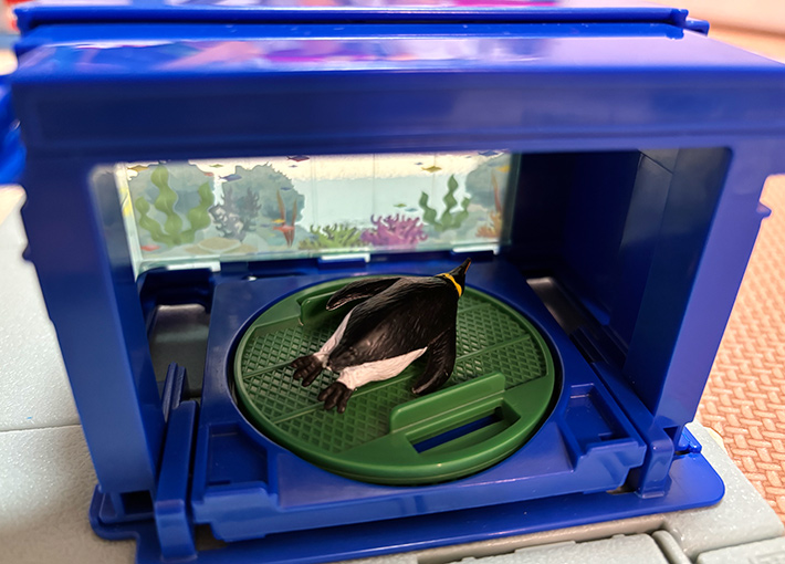 水族館の模型の中にはターンテーブルが入っており、タカラトミーから発売されている手のひらサイズの動物フィギュア『アニア』の海洋生物を収納して楽しめますよ。