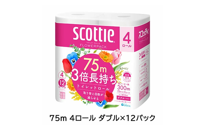 スコッティ フラワーパック 3倍長持ち 75m 4ロール ダブル×12パック トイレットペーパー scottie 送料無料 00286