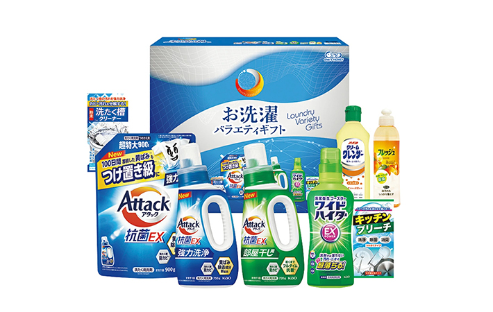 内容は『アタック抗菌EX(本体750g、詰替900g、部屋干し用本体720g)』『ワイドハイターEXパワー(本体560ml)』『食器用洗剤オレンジ(本体250ml)』『クリームクレンザーレモンの香り(本体400g)』『洗たく槽クリーナー』『キッチンブリーチ』の8点。