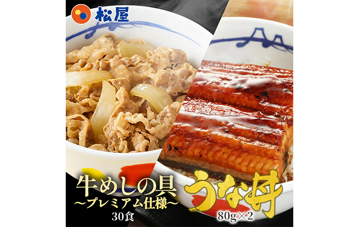松屋で人気の『牛めしの具プレミアム仕様』『鰻カット』が入ったお得なセットです。