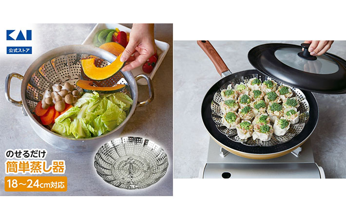 こちらは、18~24cmまでの鍋やフライパンにのせるだけで蒸し料理が手軽に作れる蒸し器。