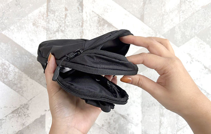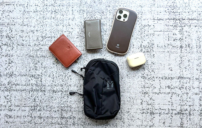 このポーチにはスマホやミニ財布、鍵、ワイヤレスイヤホン、ICカードなど、よく使うものをまとめて収納することが可能。