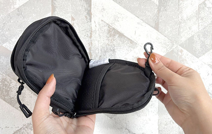 リュックはもちろん、ボディバッグに取りつけたり、カラビナを使ってトートバッグにつけたり、ベルトループに通してウエストポーチのように使ったりと、さまざまなバッグやベルトに取りつけることが可能。