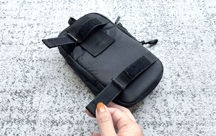 背面にベルトループとカラビナループがついており、リュックのショルダーベルトに外づけできるので、よく使うものをポーチに入れておけばリュックをわざわざ下ろさなくてもサッと取り出せて便利ですよ!