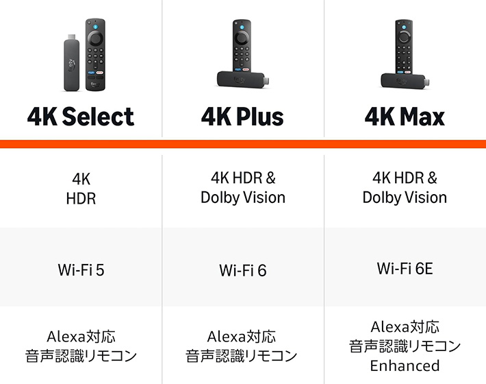 『Fire TV Stick』は、『4K Select』『4K Plus』『4K Max』の中から選べば基本的にOK。