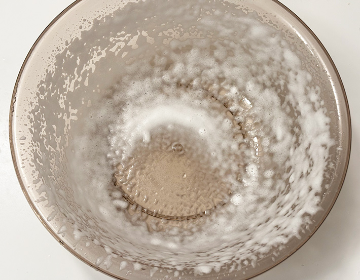 どのように泡が噴射されるのか、色つきの洗面器を使って試してみます。