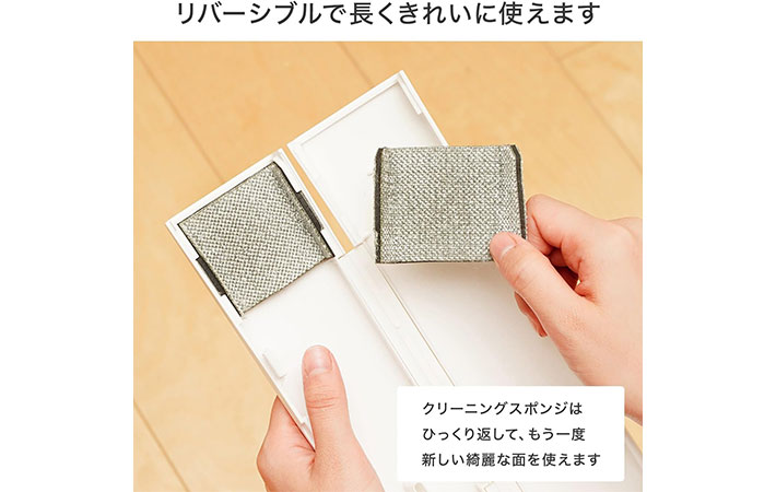クリーニングスポンジはリバーシブルで使えるので、長期間きれいに使えますよ。