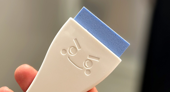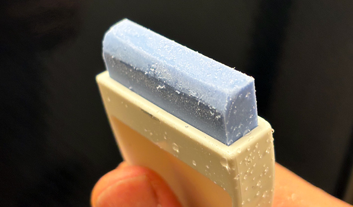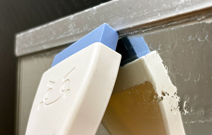 『鏡のウロコ取り ハンディ』の研磨材部分を見ると、しっかりと擦り減っていることが分かりますよ。