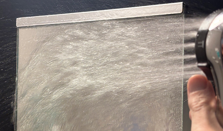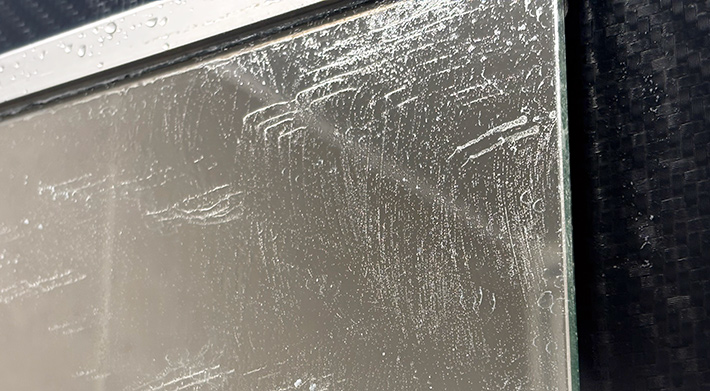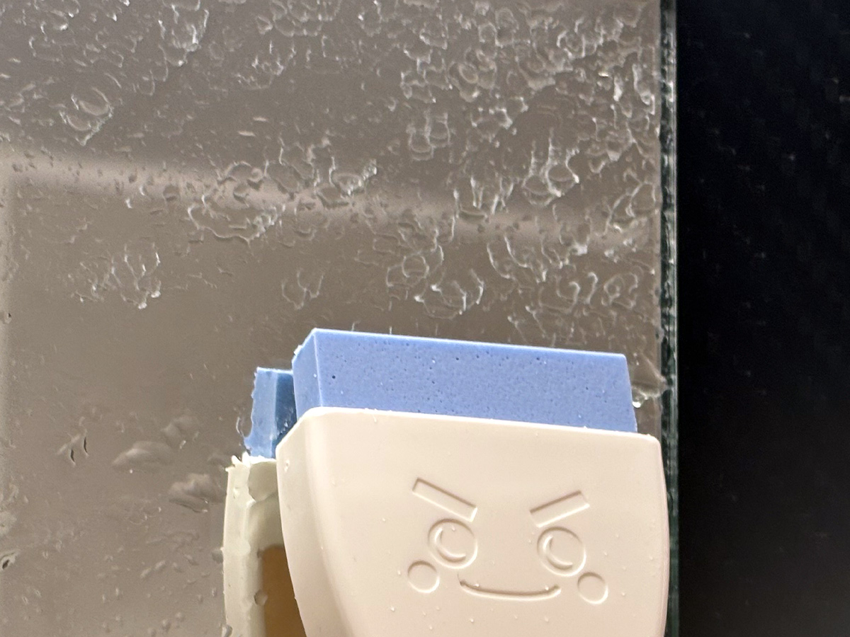鏡にシャワーの水をかけて、早速、ウロコ取りに挑戦です!