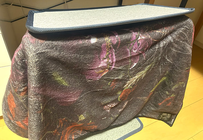 もちろん、パネルヒーター単体で使ってもいいのですが、天板にブランケットを挟むと、足先だけでなくふくらはぎまですっぽりと覆ってくれて、まるでこたつのように使えるんです!