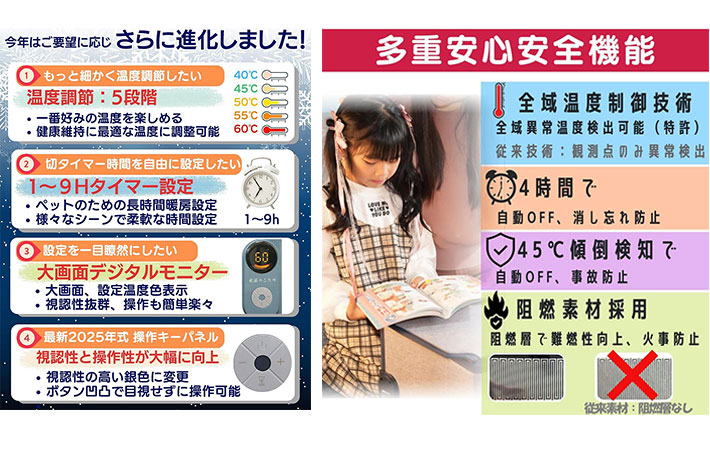 また、4時間で電源が自動オフになる消し忘れ防止機能がついていたり、転倒検知自動オフ機能がついていたりと、子供でも安心して使えますよ。