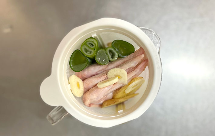 残りの材料も、ストレーナーに入れていきましょう。鶏肉のサイズにもよりますが、ギュギュッと押し込んでOK。