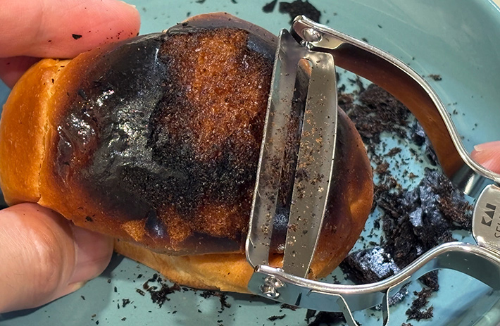 切れ味の凄さを実証できたのが、パンの焦げを取り除くこと。