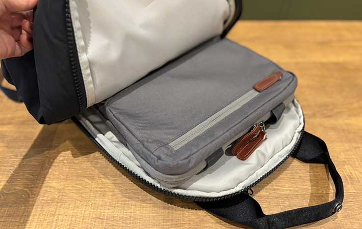 背面にしっかりとしたクッションを装備しており、メインのコンパートメントとは独立した大型のポケットには、15インチまでのノートパソコンが入れられますよ。