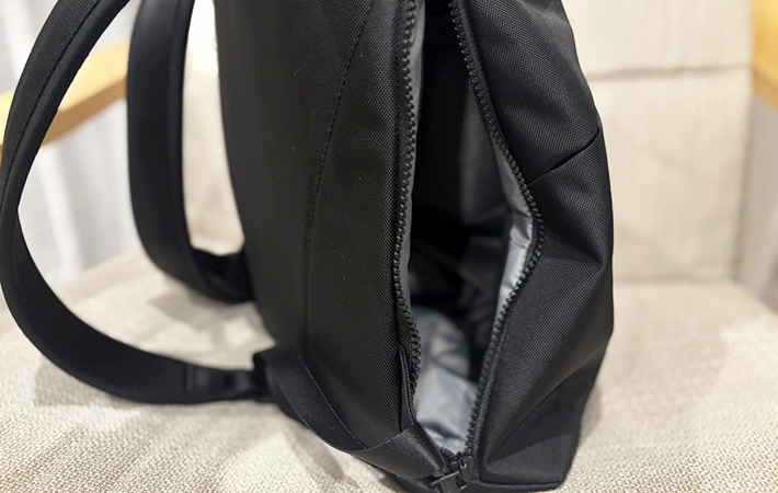 リュックのサイドにもファスナーがついているので、背負ったままでも手を回せば、簡単に中身を取り出しやすくなっています。