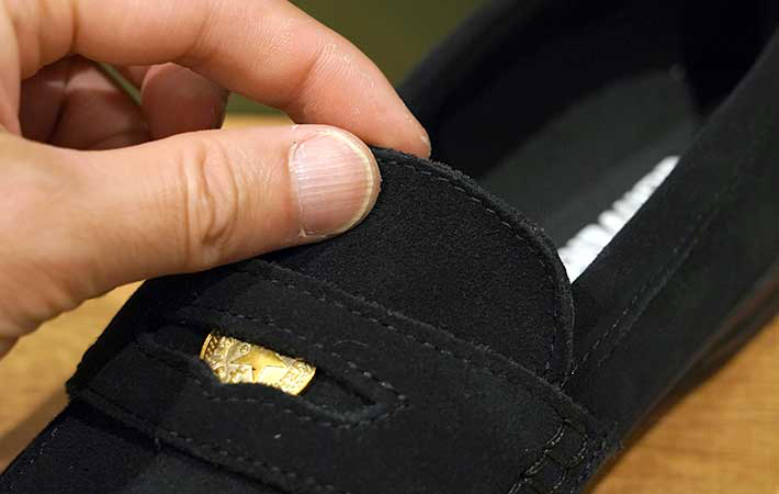 毛足の短い上質なスエードと、ワンポイントアクセントになったオリジナルコインの装飾がおしゃれですね。