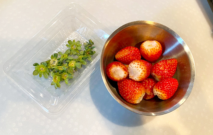 「サクッ」「パチン」という感覚がクセになり、大量のイチゴのヘタ取りが気づくとあっという間に終了していました。