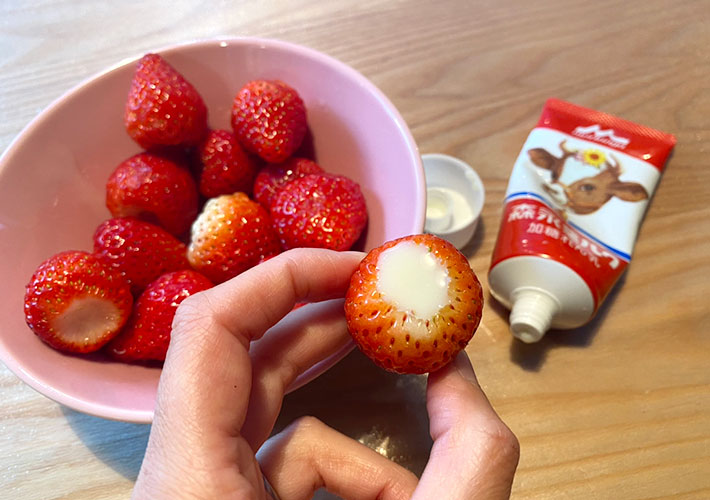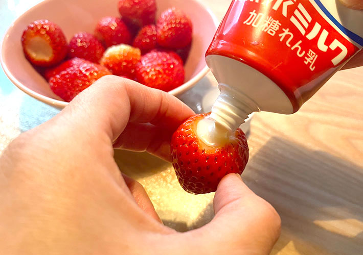 ヘタを取った後の凹みが練乳を入れるのにちょうどいい深さなんですよね!