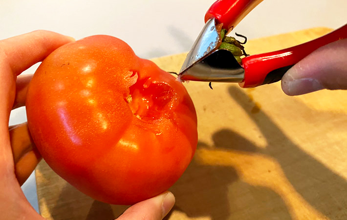 そして、刃の先で芯とヘタを挟み、そのまま引き抜くと…。