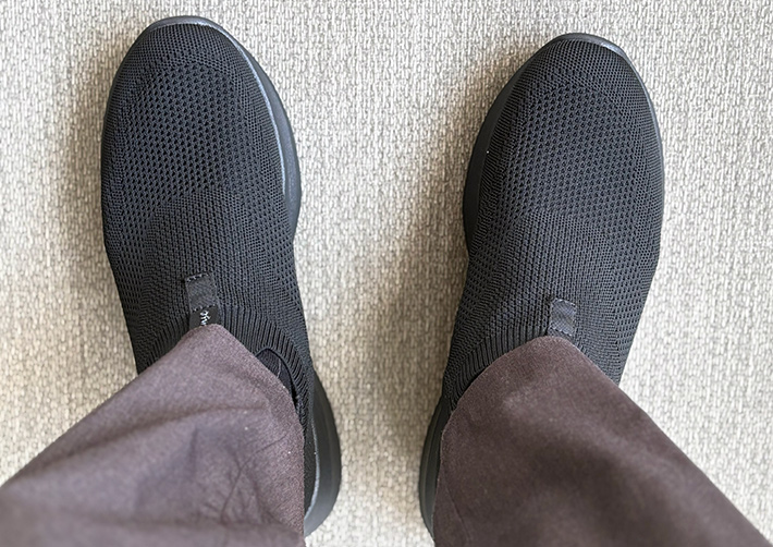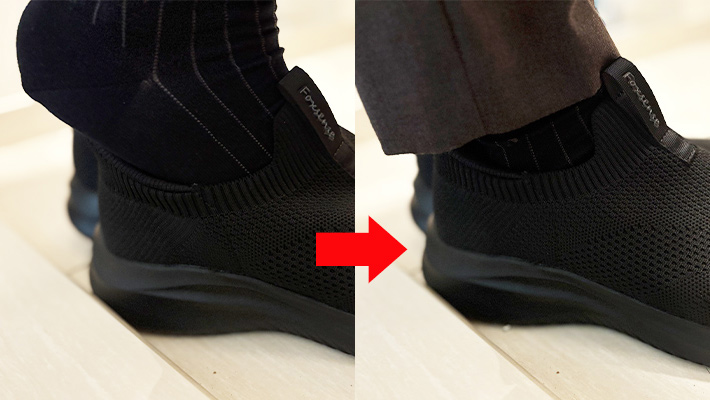 つま先側をシューズに入れてから、カカトをストンと落とすだけでスムーズに履けて、ノンストレスなんです。